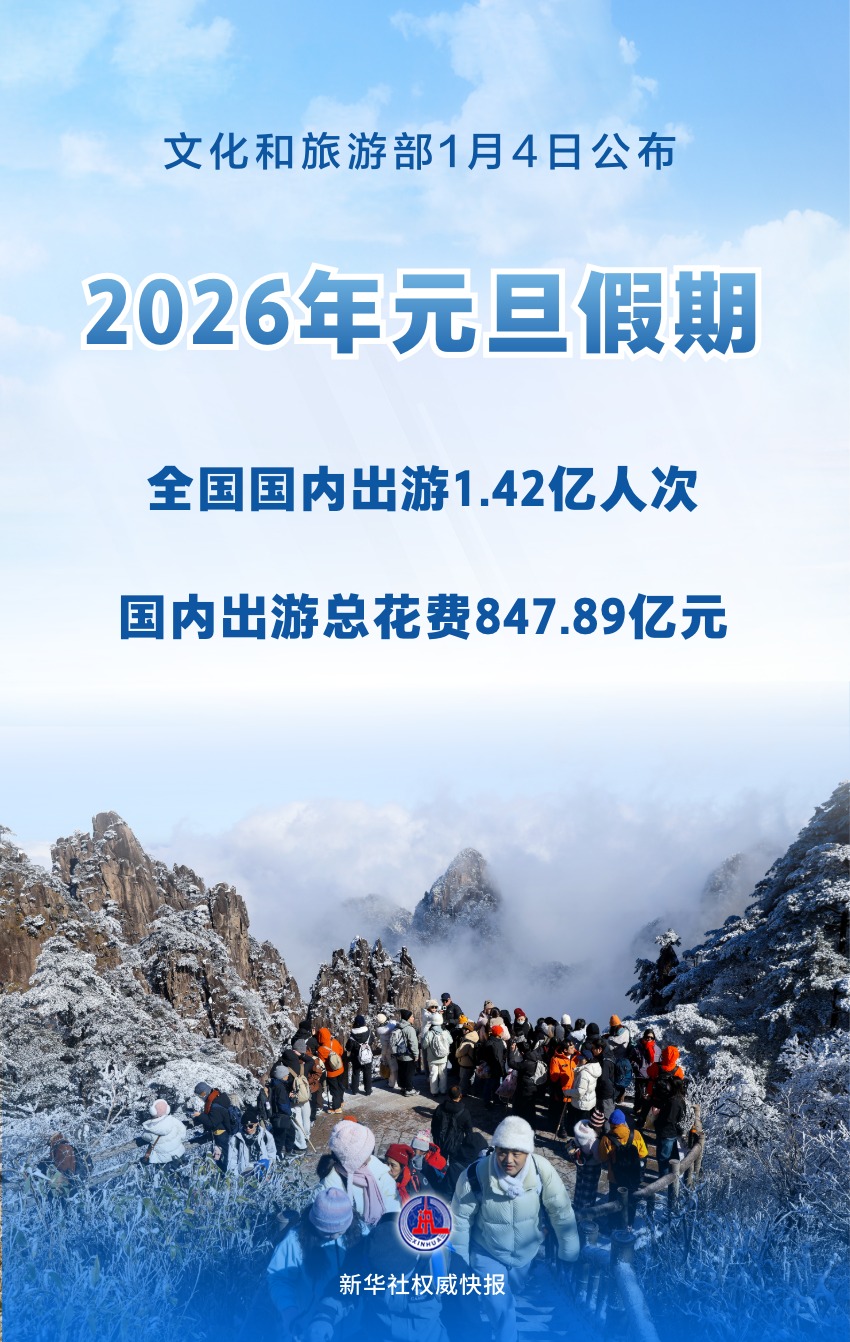 文化和旅游部1月4日公布2026年元旦假期文化和旅游市场情况。元旦假期3天,全国国内出游1.42亿人次,国内出游总花费847.89亿元。